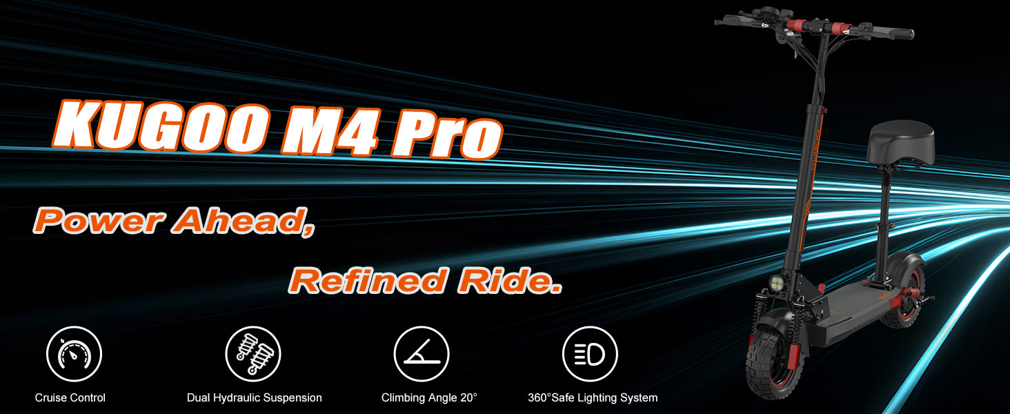 • The KUGOO M4 PRO features 10-inch tires, puncture-resistant tires designed for city streets and light off-road conditions.